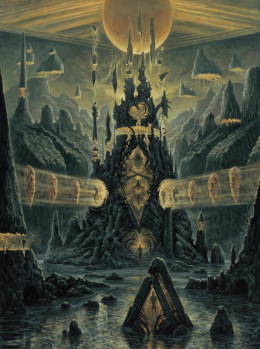 A central tower where an Omni present being resides. The architecture is gathered together from eons of ancient ruined remains and fragments of historical layers drawn from the surrounding sediments and strata. Which have long since built up around lost civilization. Whatever remaining life forms residing in the barren land may be. They are drawn to this place where they fall into a slumber and become absorbed by the structure. Becoming part of its nest, food for its continuing reign, and carbon for its walls. Essential life and soul essences are harvested and fused. Expelled eventually as contained ghost pods. Each one an individual creation resembling ancient sarcophagus floating into the ether.