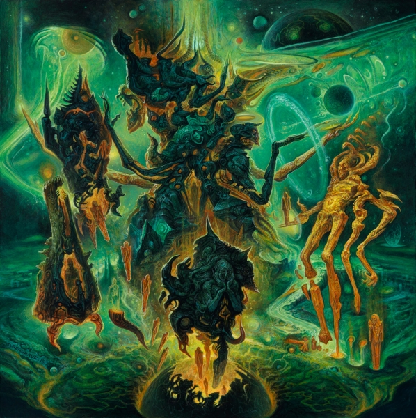 Encapsulates the concept of life and death on a cosmic level. Otherworldly elemental beings give birth to twin packaged Sarcophagus. Each carrying a coupled deceased to their astronautical destiny. Atomically driven into particles of the unknown.